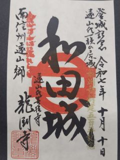 遠山資料館の後、和田城本丸跡に建つ龍淵寺のご住職の手書きの御城印を皆様に進呈致します。