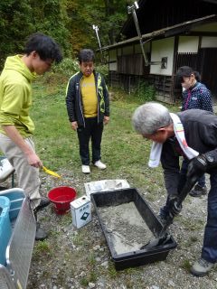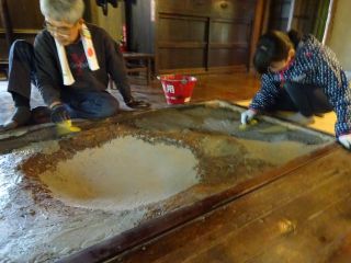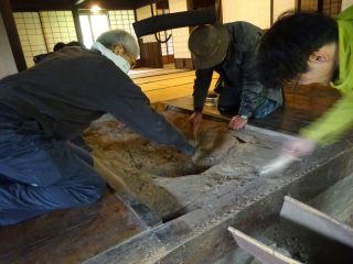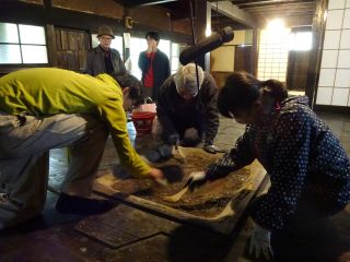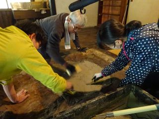 江戸末期~昭和初期にかけて建てられた「大平宿」には、囲炉裏やかまどが残っており、現在も使用しています。今回のツアーでは囲炉裏の底が薄くなっており修復が必要なため、参加者の方と一緒に修復作業を行いました。