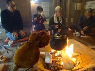 ここで昼食タイム。参加者や現地管理されている方みんなで囲炉裏を囲んで五平餅を頂きました。囲炉裏を囲んで食べる五平餅は格別ですね。食べて休んで午後も作業頑張ります!