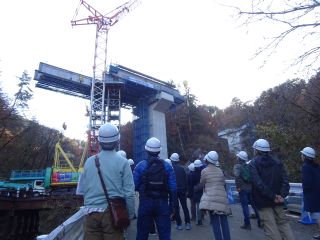 午後は飯田上久堅・喬木富田IC~矢筈トンネル間の建設現場を見学しました。この区間は深い山の中を通っており、建設現場へは工事用道路を通って向かいます。橋梁の建設現場ではとても大きなクレーンが荷揚げを行っておりました。
