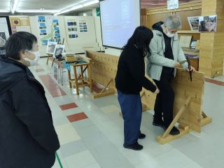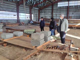 先ずは和船作りの現場、市田造船所を訪れました。造船作業中ではありませんでしたが、先ず普段は見ることができない船底板を拝見し、使う道具や語り継がれてきた船大工技術のお話や、古写真を見せてもらいながらのお話をして頂きました。続いて時又港にあるミニミュージアムに移動して、和船の歴史のお話を聞かせてもらって午前の部が終了です。